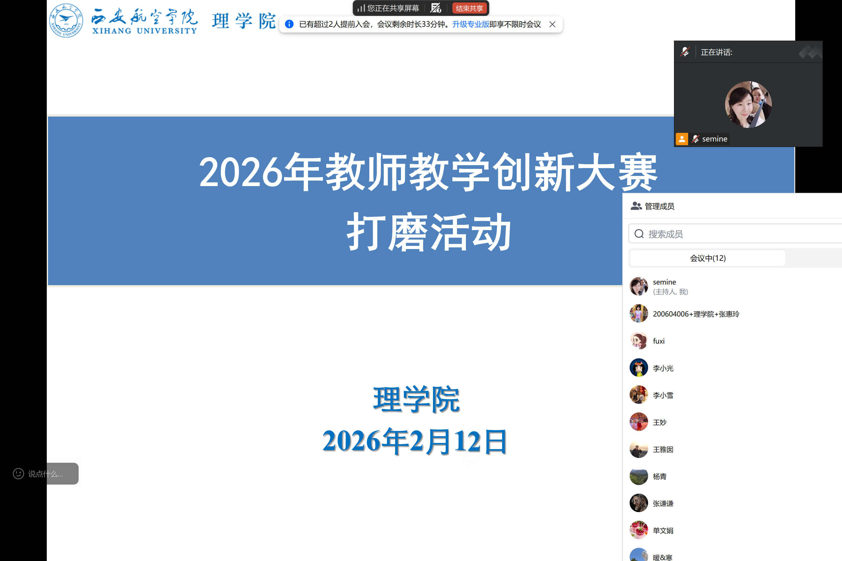 为深入落实“以赛促教、以赛促改、以赛促学”的教育理念,助力参赛教师精准把握第六届高校教师教学创新大赛(简称“教创赛”)评审标准,优化参赛作品质量,切实提升教师教学创新能力与赛事竞争力,理学院于2026年2月12日组织开展教创赛线上打磨活动,学院领导、历届参赛教师、教研室主任、专业负责人等参加了活动,活动由院长助理王小梅主持。