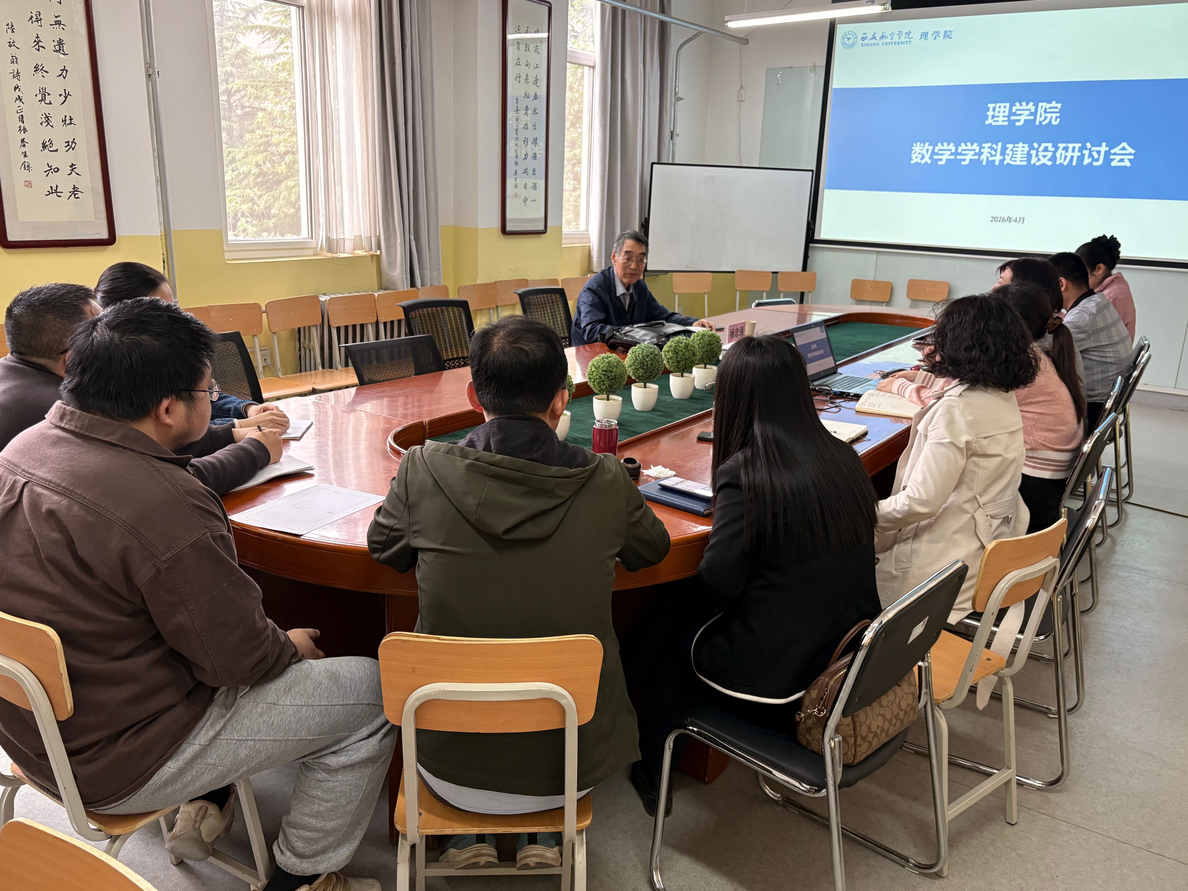 2026年4月8日上午,理学院数学一级学科建设研讨会在南428召开,特聘教授杨忠强,理学院院长李小光,副院长韩慧蓉,数学教研室部分教师出席了研讨会。研讨会由李小光主持。