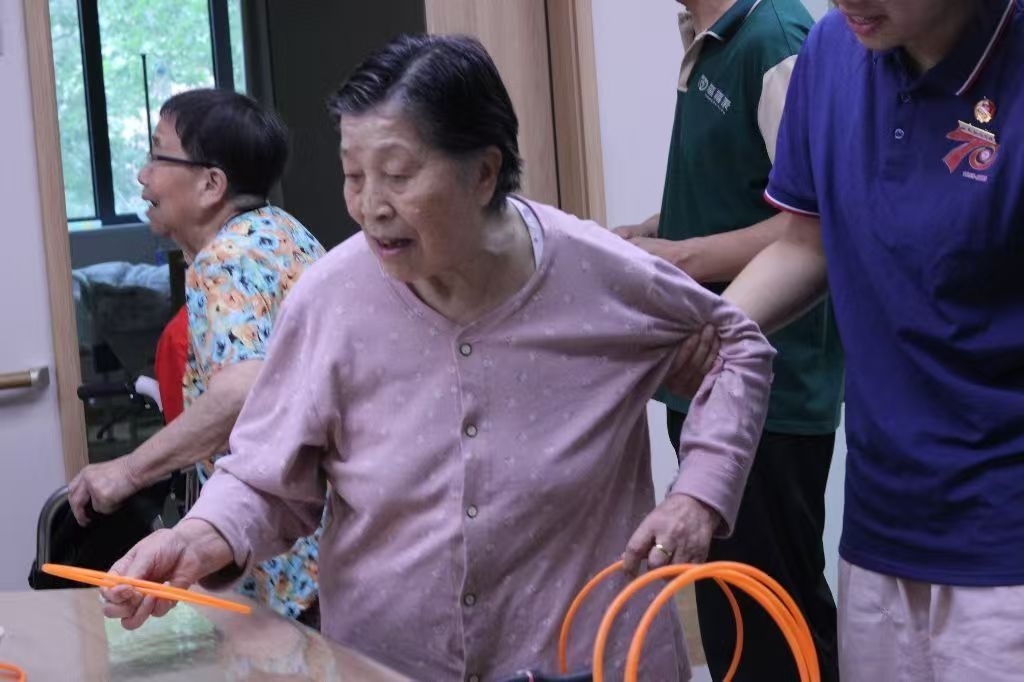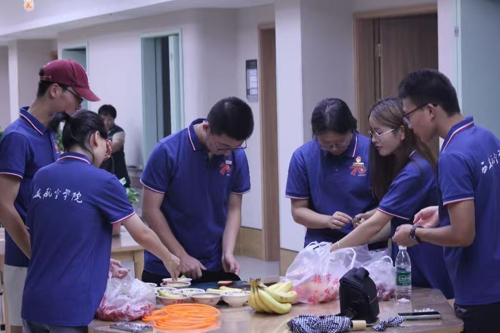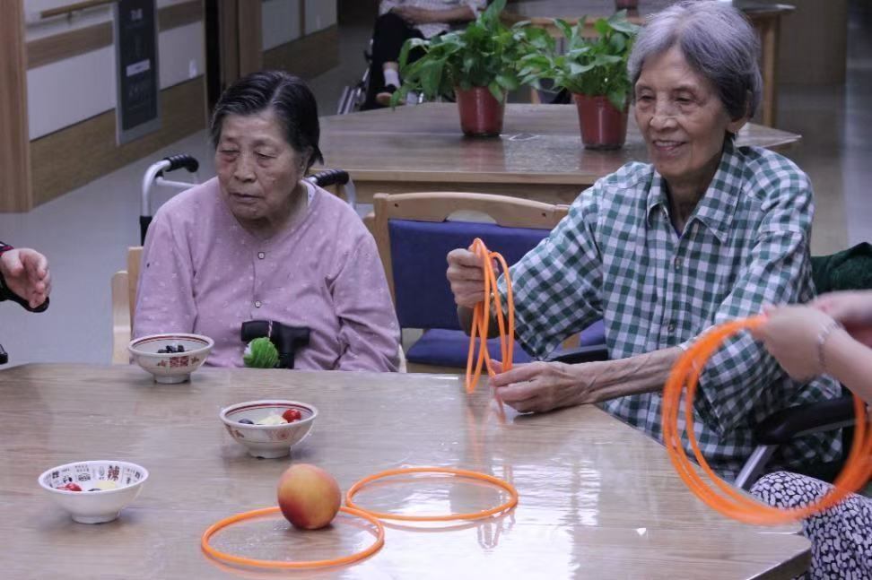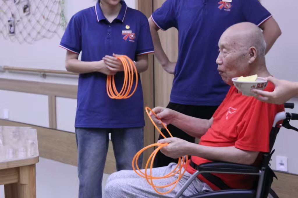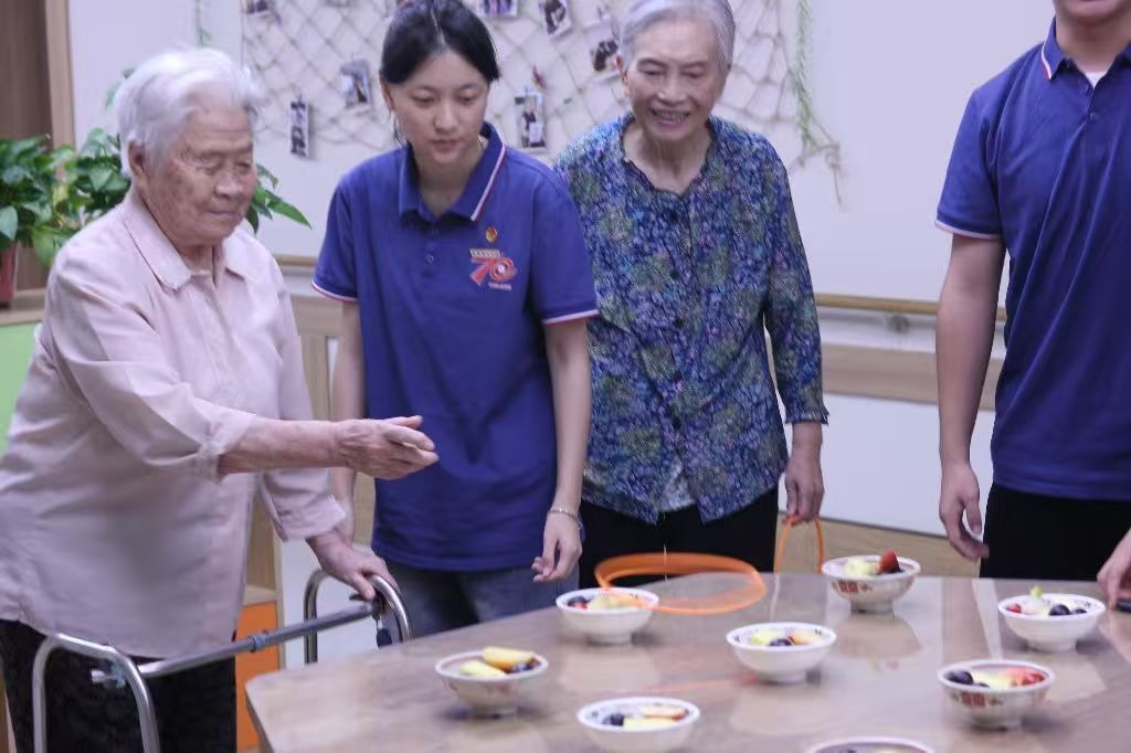 空气中弥漫着清甜的果香,碗碟盛放着洗切分好的桃肉、葡萄、荔枝和小番茄,如同夏日调色盘。一隅空地被清晰划开,成为游戏的战场——这里,西安航空学院“青春助老行,共话夕阳红”暑期实践队的年轻面孔,正在福禧康健康照护中心,为暮年的眼眸点燃一簇期待。