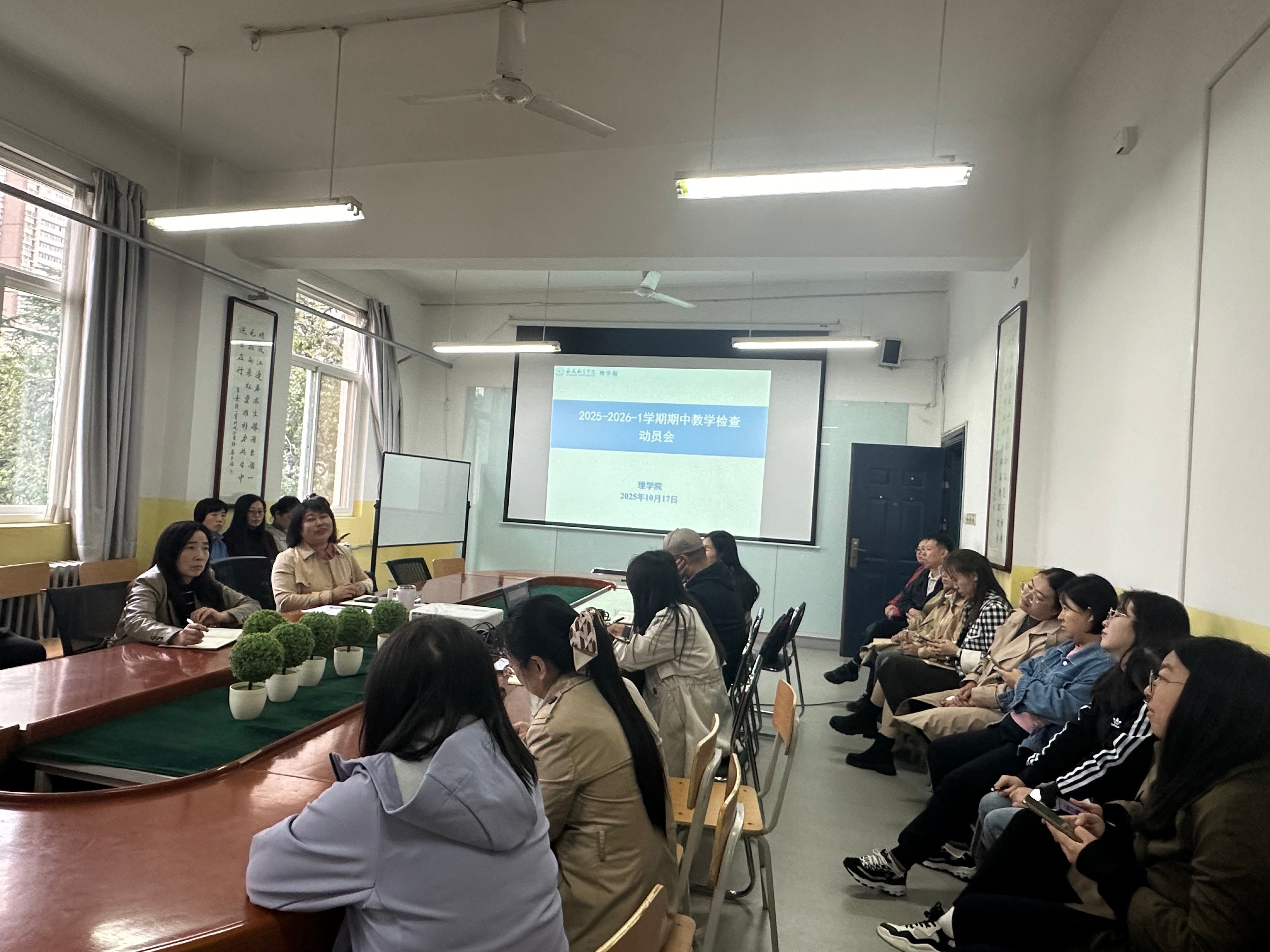 为深入贯彻落实学校关于本科教育教学质量提升的工作要求,紧密结合本科教育教学审核评估工作部署,及时发现并解决教学过程中存在的问题,巩固与拓展前期审核评估专项教学资料检查的整改成果,进一步规范教学秩序、浓厚学风氛围,10月17日下午,理学院在南428会议室召开期中教学检查动员会,理学院全体教职工参加了会议。会上,院长李小光首先传达了学校期中教学检查工作的整体部署与核心要求,并着重强调本科教育教学审核评估对学院教学工作的指导意义。她指出,教学质量是学院发展的生命线,期中教学检查既是教学质量监控的重要环节,更是对标审核评估要求、检验前期整改成效的关键举措。全体教职工需高度重视,以严谨务实的态度投入到检查工作中,确保检查不走过场、取得实效,切实为后续教学工作高质量开展及审核评估迎检工作奠定坚实基础。